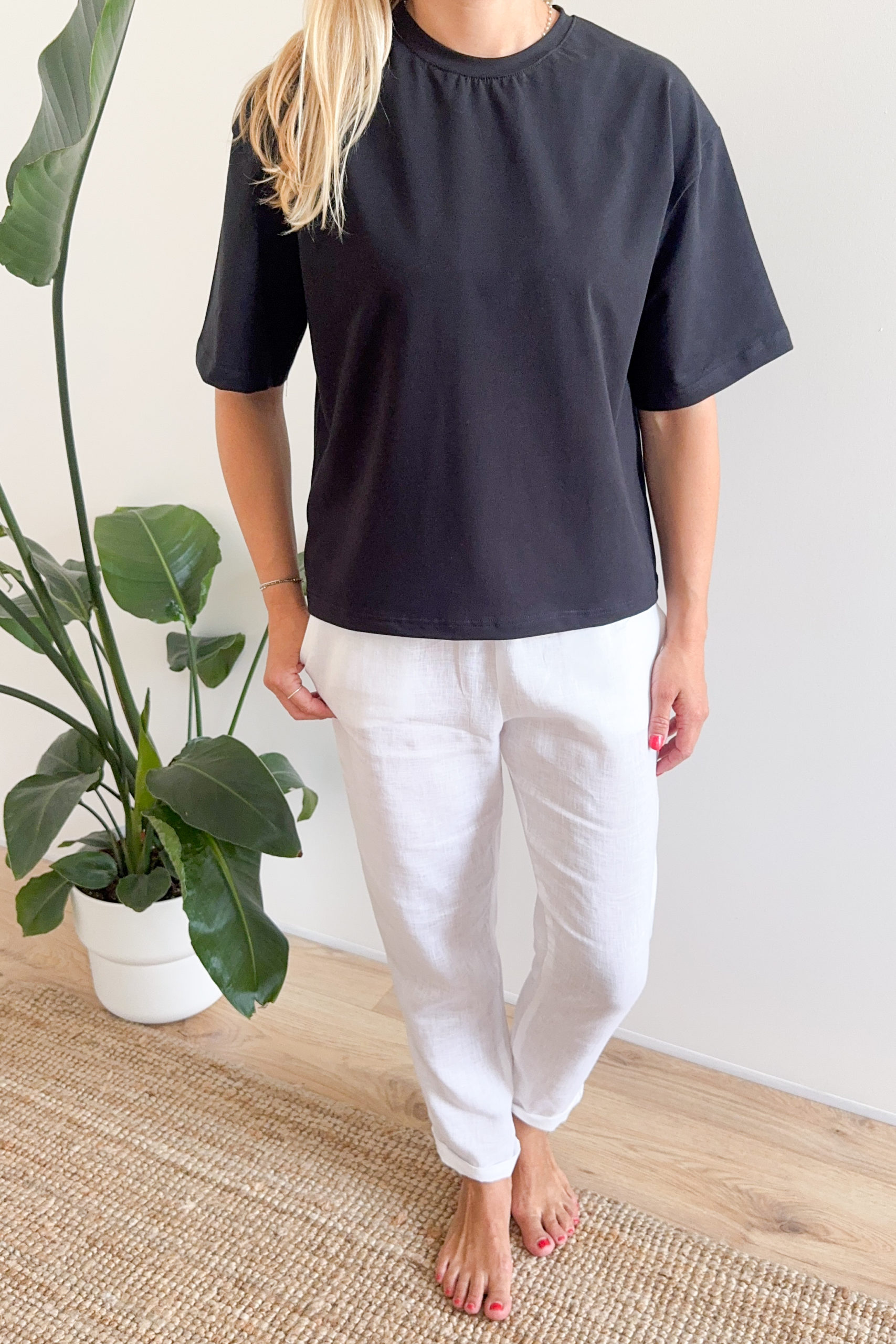Tyto skvěle padnoucí kalhoty z kvalitního lnu jsou ideální volbou pro teplé dny i vrstvení během chladnějších měsíců.